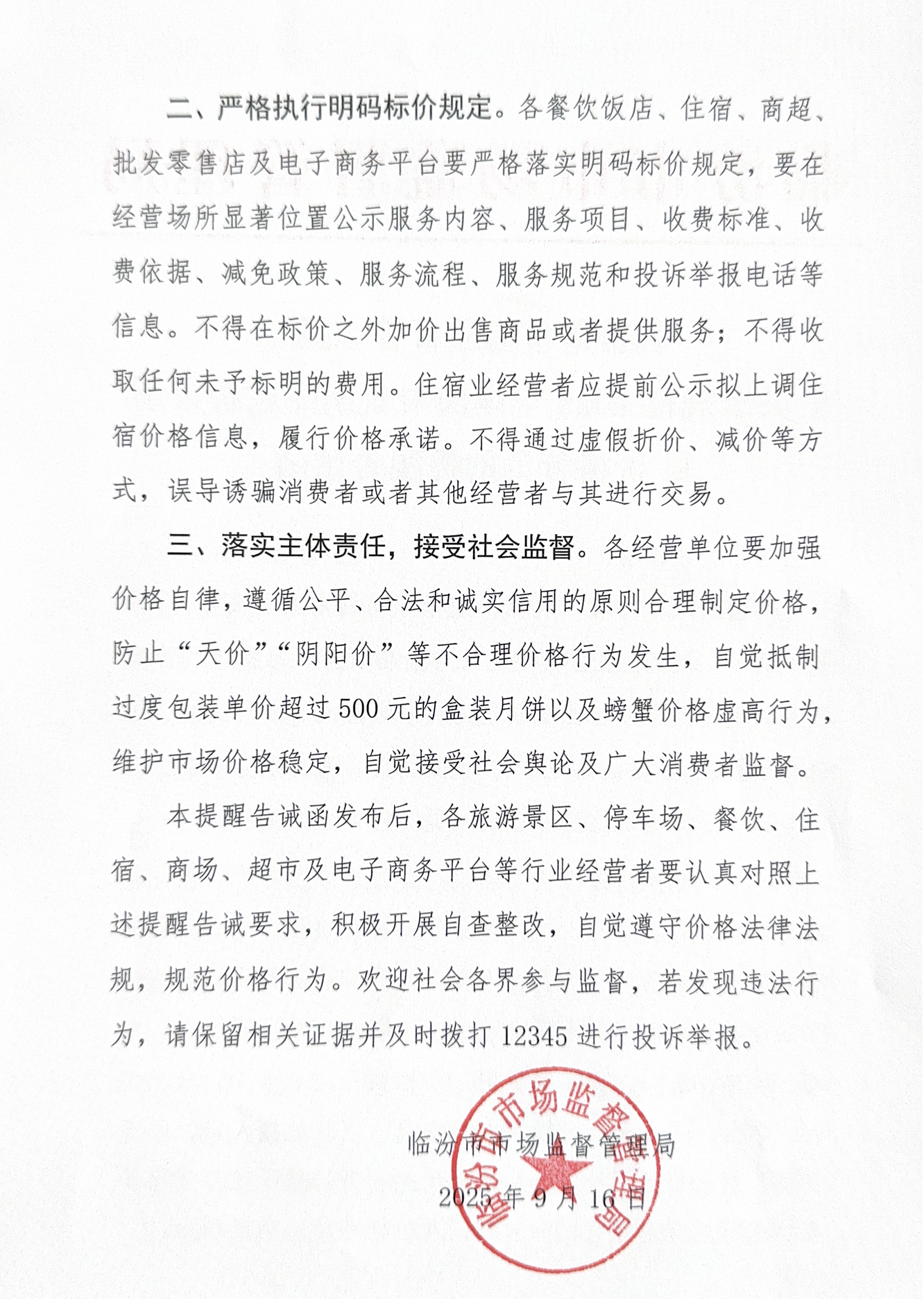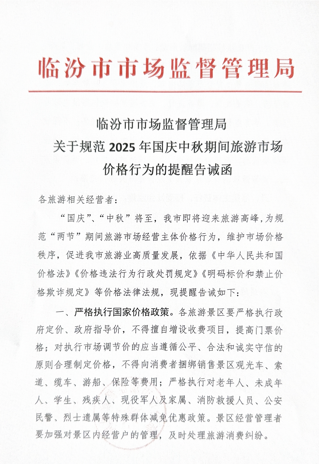 临汾市市场监督管理局关于规范2025年国庆中秋期间旅游市场价格行为的提醒告诫函