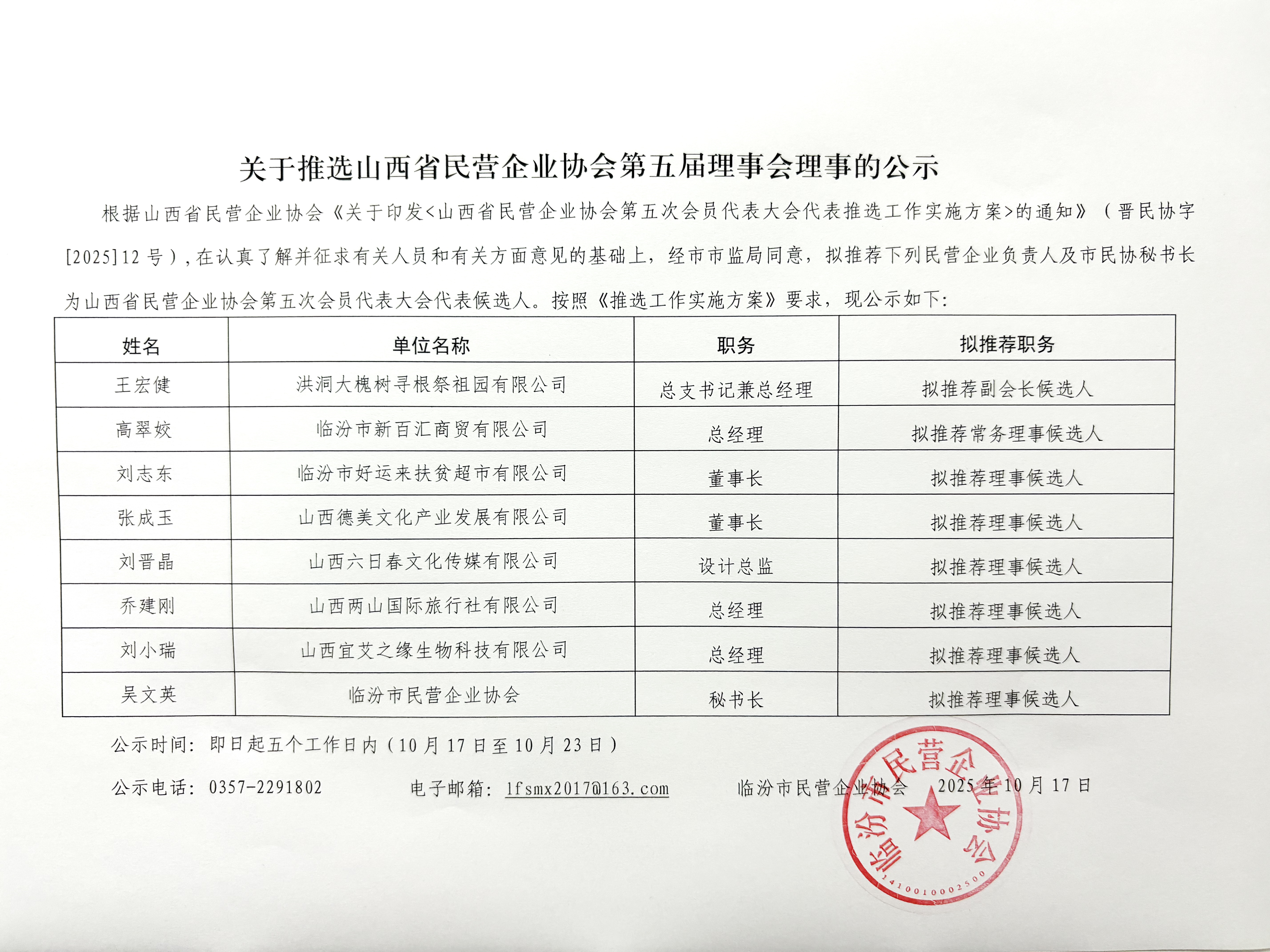 关于推选山西省民营企业协会第五届理事会理事的公示